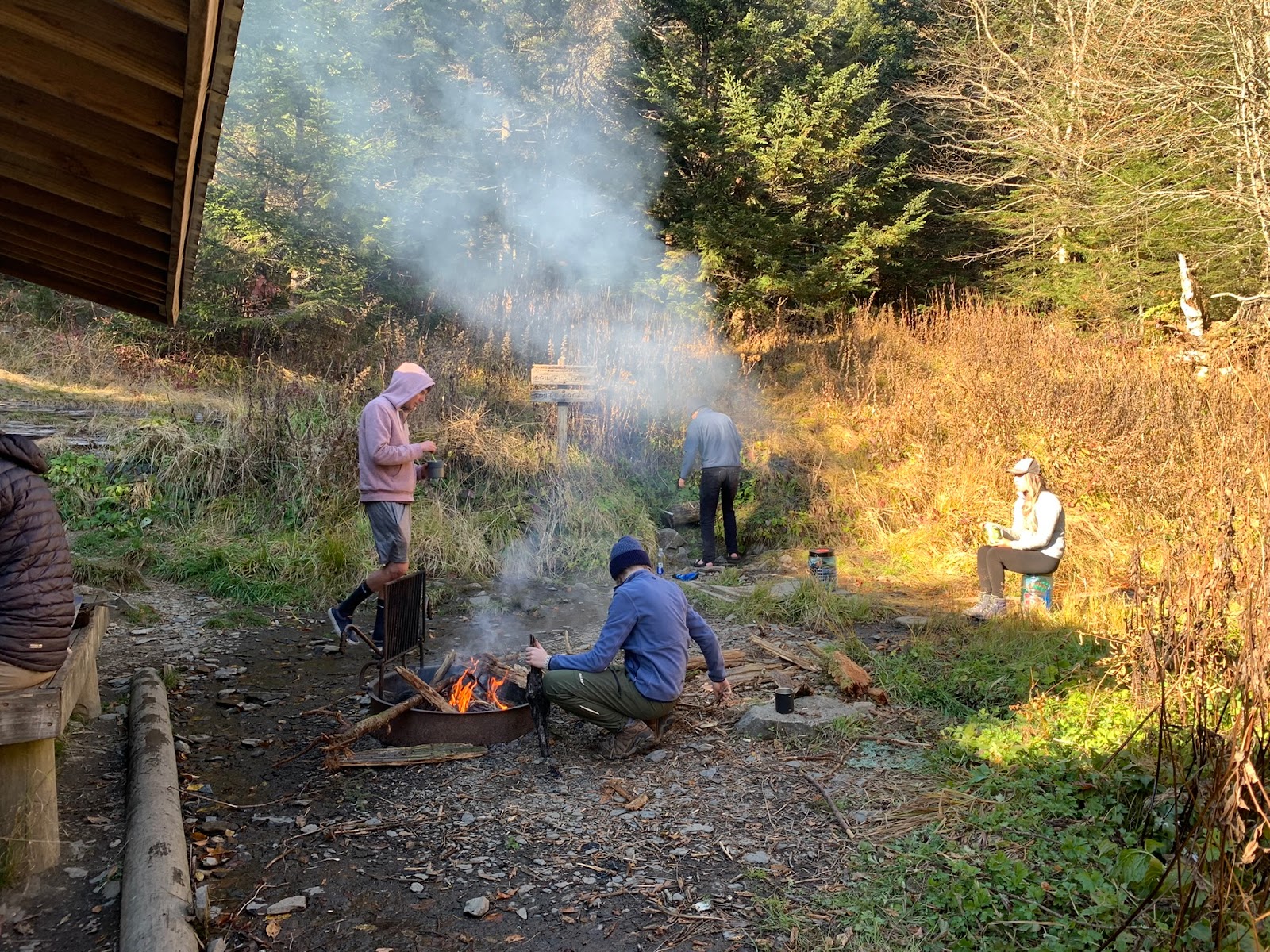 After reaching the beach, you have to climb up a bit and cross the River Scavaig to reach the little jutting piece of land where we intended to camp. It was actually a longer and more difficult walk than it seemed from the top of Sgurr na Stri (and even while looking at it while approaching the Bad Step). But we finally got there, wet and happy, and saw 2 tents already set up and some kayaks resting nearby. To our surprise, we also saw a nice looking white and blue building, which we have since learned is the Coruisk Memorial Hut. The hut is privately owned and used by some local Mountaineering Club dedicated to some dudes who died up in the Cuillins in the 80s. We noticed a light on in the hut, though, and decided to knock on the door. 2 older guys let us in to check it out and told us that they had come down from nearby Bla Bheinn and were working into the Cuillins proper the next day. They had rope and full climbing equipment--no joke. Compared to something like that, the Bad Step is probably a joke. Huge respect to those guys. We also said hi to our tent-bound neighbors and were again met with 2 middle-aged men who told us that they had kayaked in from Elgol. This was nice. The only other people here seemed to be rugged, borderline insane Scottish men. I felt like we were in good company. So we picked a likely spot, set up our tent, and crawled inside to change our wet clothes and have something to eat while we waited for the rain to calm down.